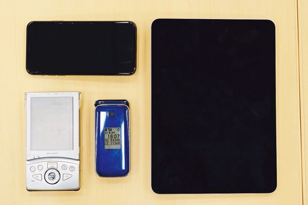 4つのデジタルツールを併用。スマホをメインに、ガラケー、タブレット、スケジュール管理端末を、適材適所で駆使していく。