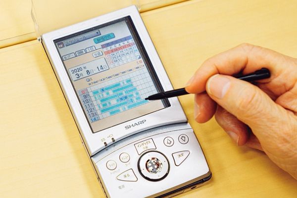スケジュール管理は専用端末で。打ち合わせ相手の基本情報や、過去のやりとりの履歴が確認できる。