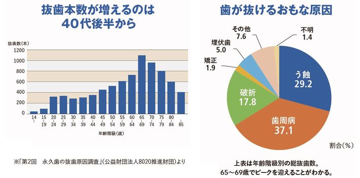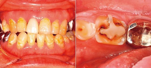 健康酢で歯の表面がドロドロに溶けた状態(左)。クエン酸をコーラで服用するのを繰り返していた患者の歯。詰め物が浮き出ているように見え、歯が大きく減っているのがわかる(右)。