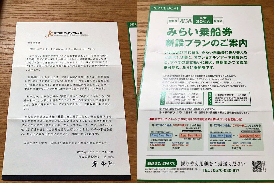 2022年のツアーをキャンセルした顧客に、主催会社から送られてきた封書の中身。36回分割での返金か、「みらい乗船券」というポイントへの振替を求める社長名の手紙と、分割払いの際の月々の返済額を示す書類が入っていた。