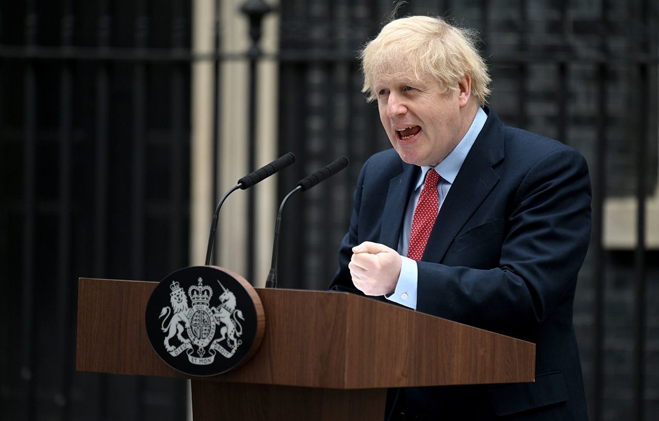 ロンドンの官邸前で声明を読み上げるジョンソン英首相(イギリス・ロンドン)=2020年4月27日