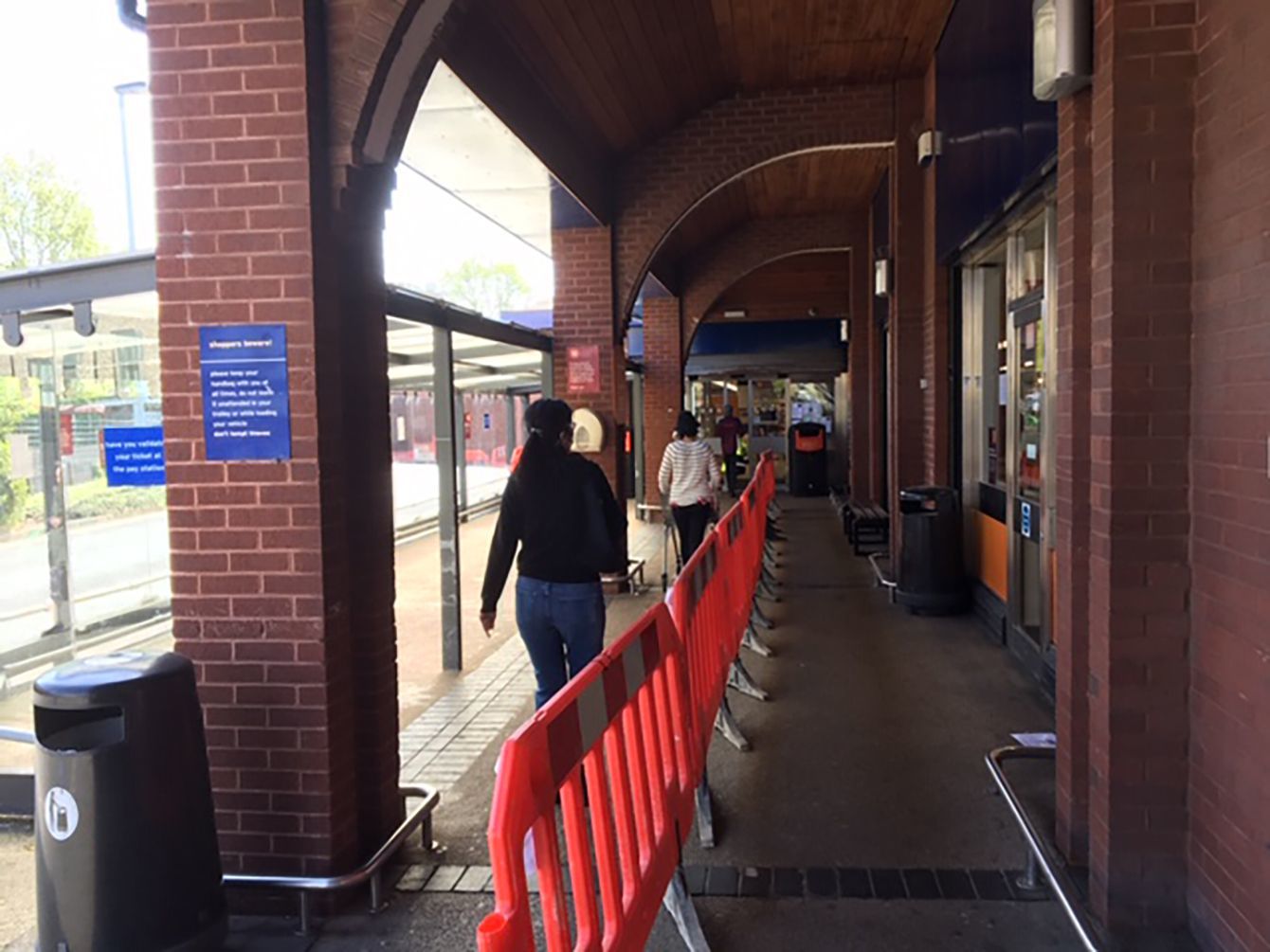 スーパーでは店内での「社会的距離」を守るため、入口手前で入場制限がかけられている。=2020年4月23日