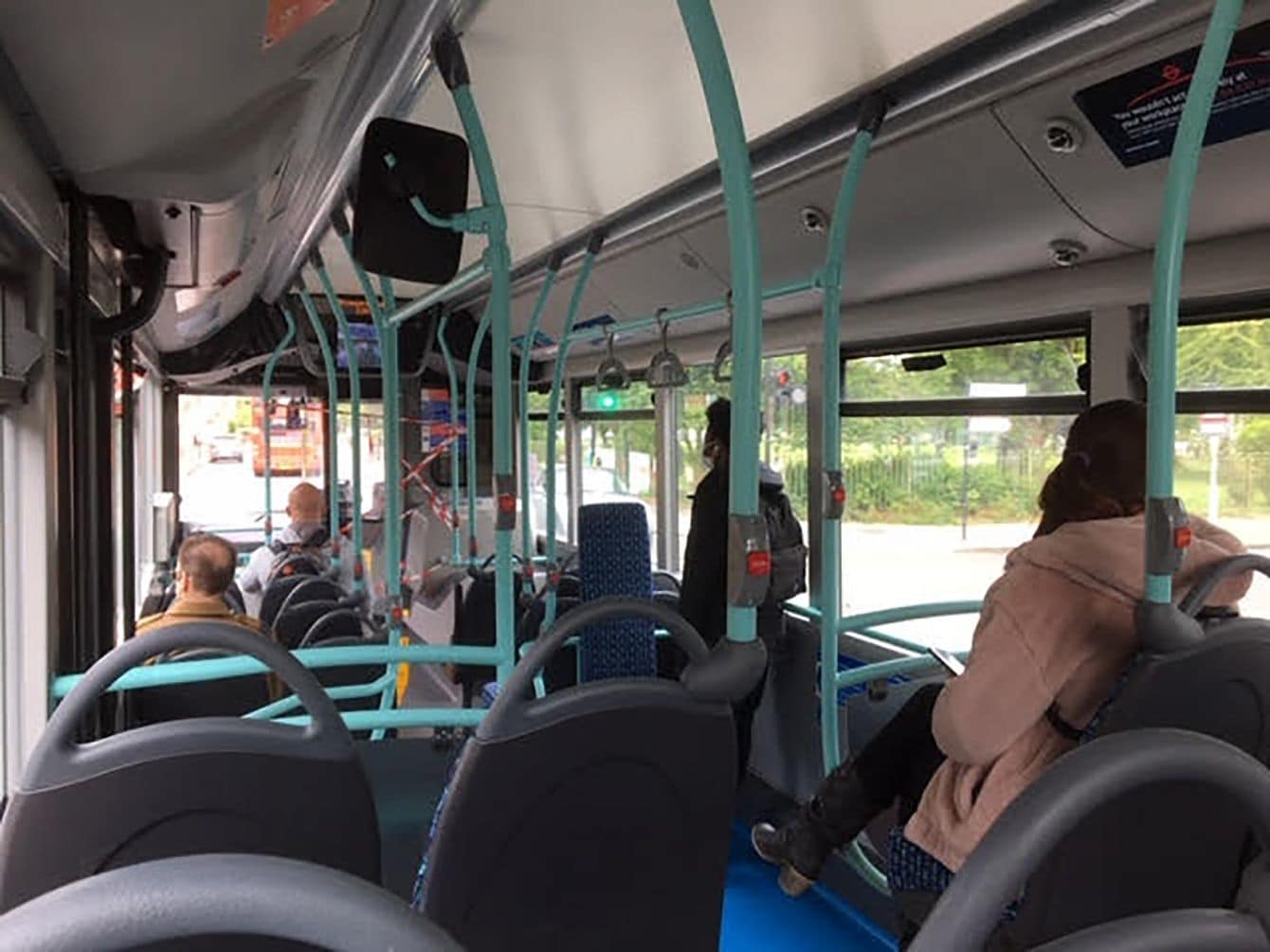 「赤い二階建てバス」では、運転手と乗客との距離を引き離す施策が。乗客同士もできるだけ間隔を空けて座っている=2020年4月27日