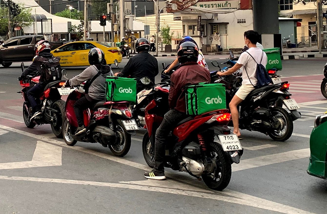 配車アプリ大手「グラブ」などのバイクが市内を走り回る。