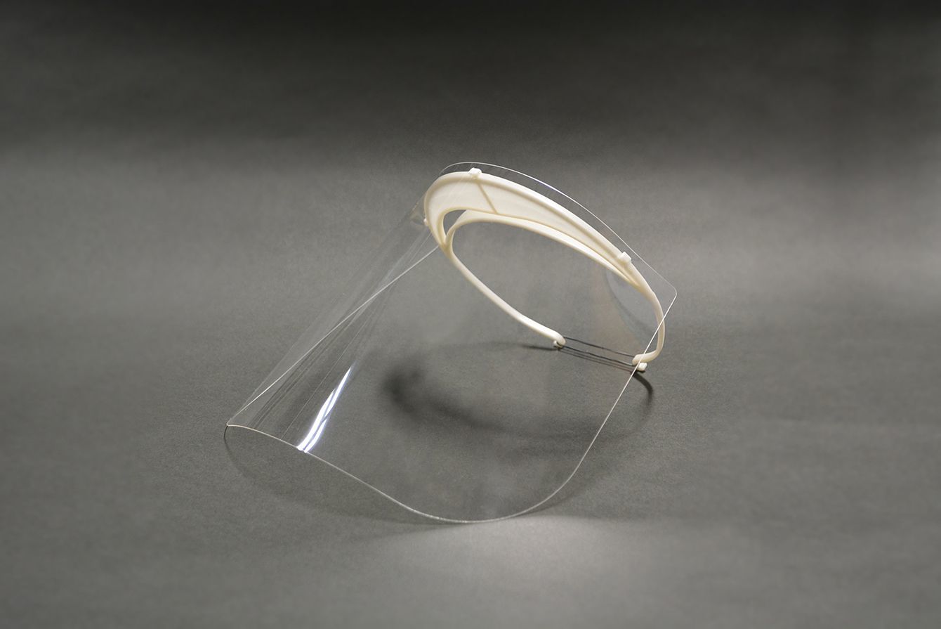 トヨタ自動車が医療現場に提供するフェイスシールド。月産4万個レベルで生産し、さらなる生産拡大を予定している。また、グループ会社においても同様にフェイスシールドの生産に着手している。