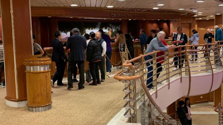 小柳さんが撮影した船内の様子。フロント前はやや人が集まっていた。