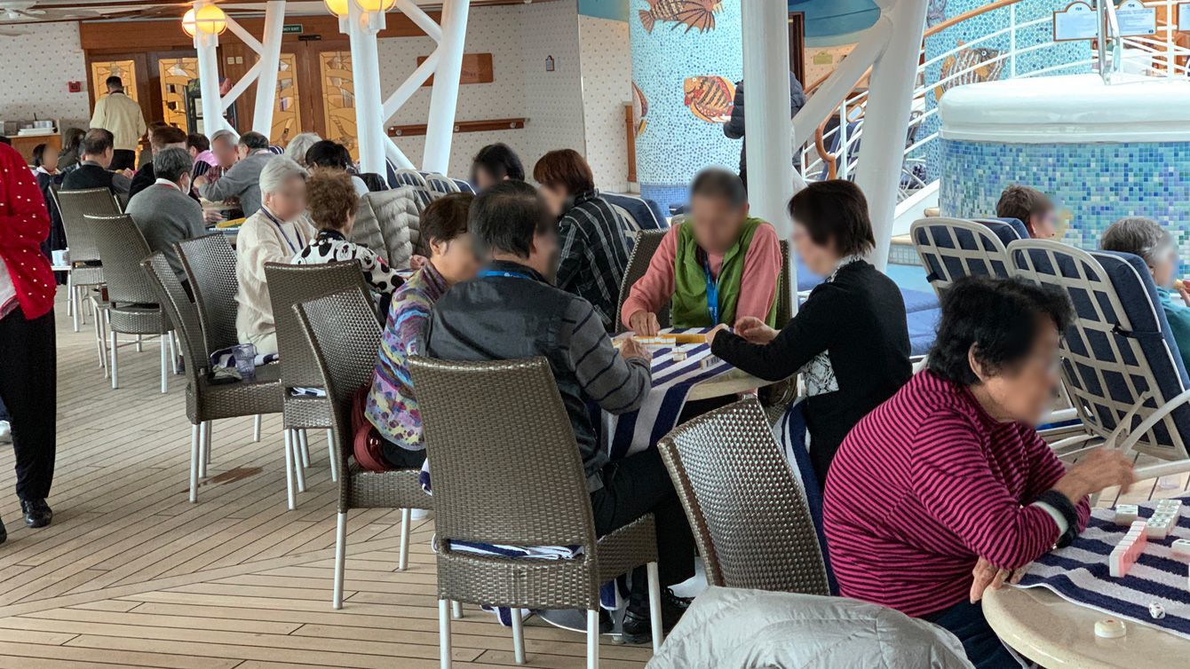 小柳さんが撮影した船内の様子。プールサイドで麻雀を楽しむなど、船内の雰囲気は落ち着いていた。