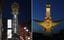 大阪府が設けた自粛解除基準の達成状況を色で伝える「新型コロナ警戒信号」の運用に合わせて黄色にライトアップされた通天閣(写真左・大阪市浪速区)と太陽の塔(同右・大阪府吹田市)=2020年5月11日夜