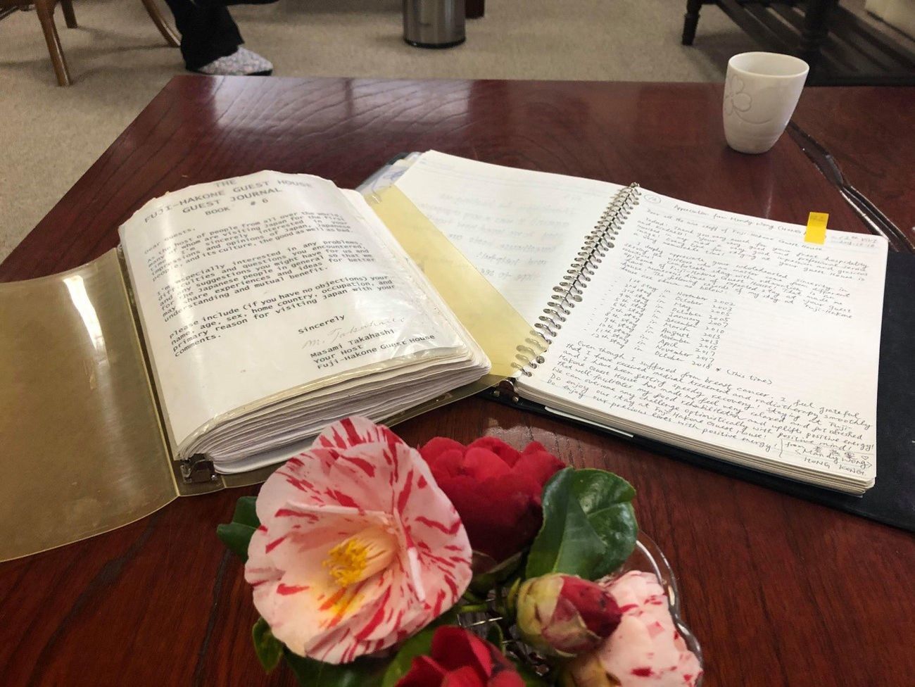 右がリピーター宿泊客専用のメッセージ・ノート。最多宿泊者は12回