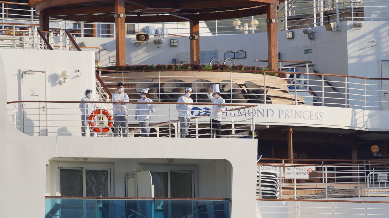 新型コロナウイルスの集団感染が起きたクルーズ船「ダイヤモンド・プリンセス」に残る乗員ら=2020年2月21日、横浜・大黒ふ頭