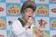 コイケヤ「わさムーチョ発売記念&新キャラクター就任記念発表会」に同社のポテトチップスの新キャラクター「ひとみおばあちゃん」として登場したタレントの志村けん=2016年9月15日、東京都内