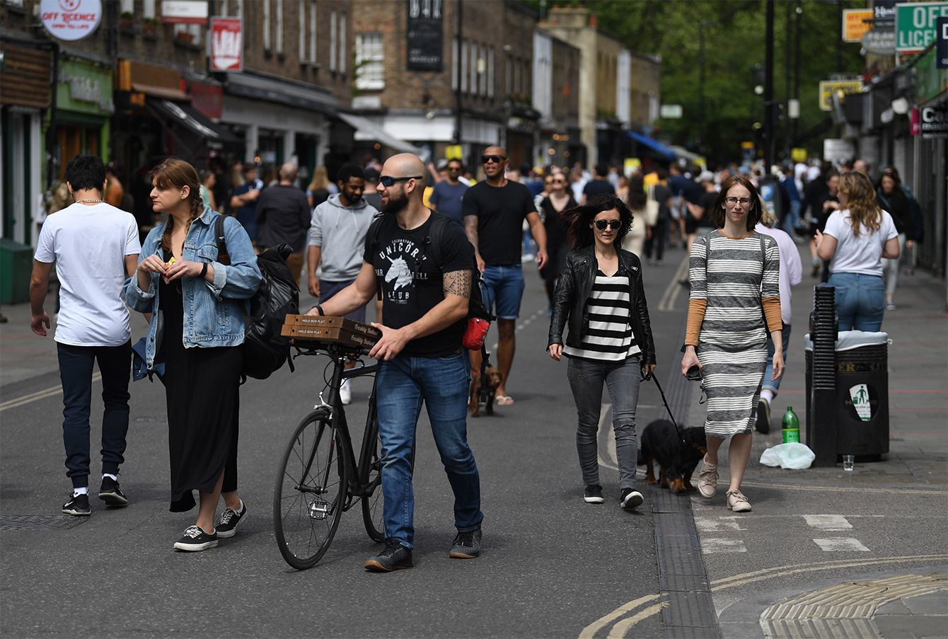 5月17日、ロンドン東部のブロードウェイ・マーケットに沿って買い物をする人々