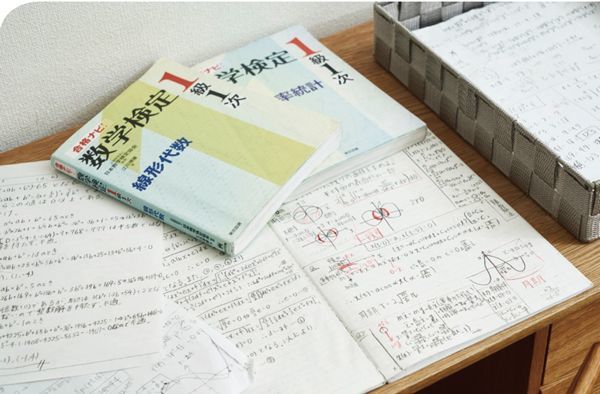 匠吾君の使っているテキストとノート。小学生と思えない丁寧な字で数式が書き連ねられている。準1級から独学での限界を感じはじめたそうだ。