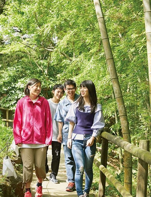 昨夏の勉強合宿の合間、ホテル裏の敷地内を散歩する2年生4人。(撮影=黒坂明美)