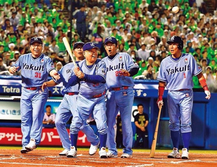 神宮球場で開催されたヤクルト球団設立50周年記念OB戦にて打席に立った晩年の野村氏(写真中)と、それを見守る真中氏(写真左)(2019年7月11日)。