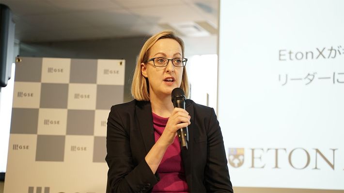 イートンXのCEO、キャサリン・ウィティカー氏。2019年11月27日にイートンXの日本展開を行うグローバルスカイ・エディケーションで行われた記者会見の様子。