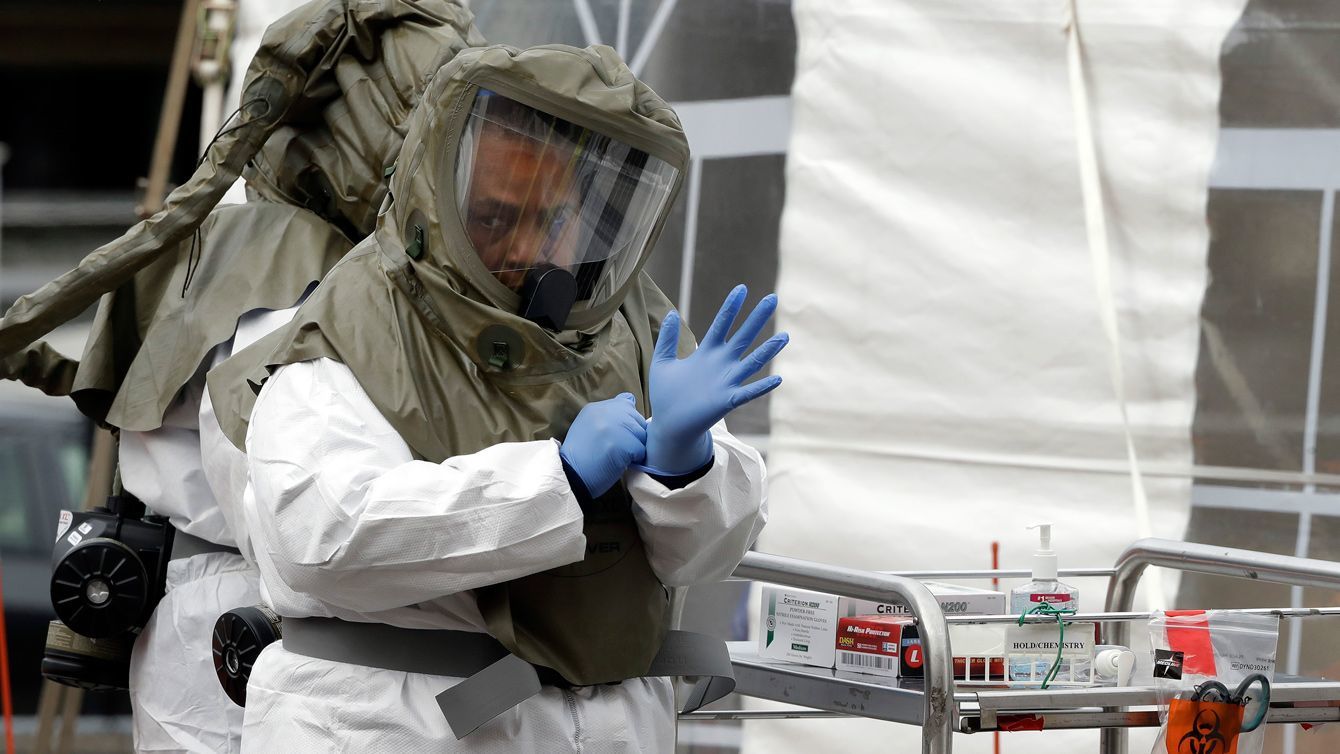 保護具を着用した医療従事者が、COVID-19試験を実施する前に手袋を調整する=2020年4月28日、マサチューセッツ州サマービルの病院の駐車場にある試験場