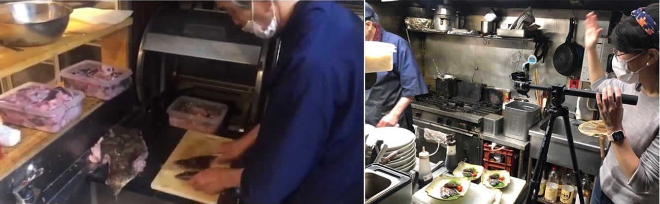 ズムメシ当日は厨房で料理長があんこうをさばく様子も中継(写真左)。厨房を撮影する様子(写真右)