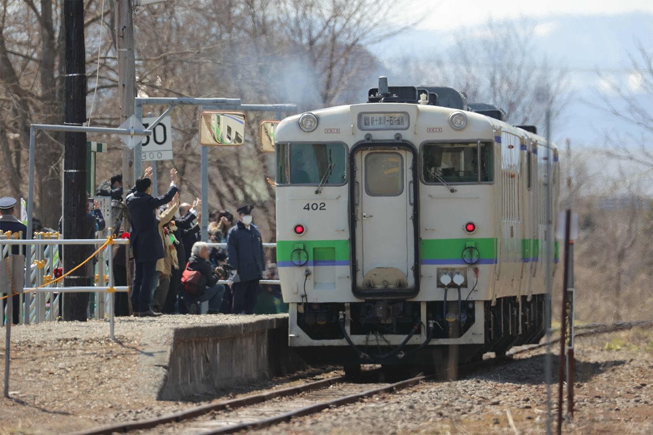 運行を終えるJR北海道・札沼線の最終列車=2020年4月17日、北海道新十津川町