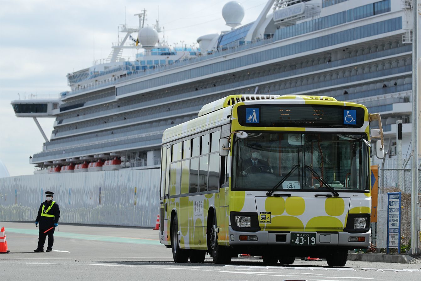 下船したクルーズ船「ダイヤモンド・プリンセス」の乗客を乗せたとみられるバス=2020年2月19日、横浜・大黒ふ頭