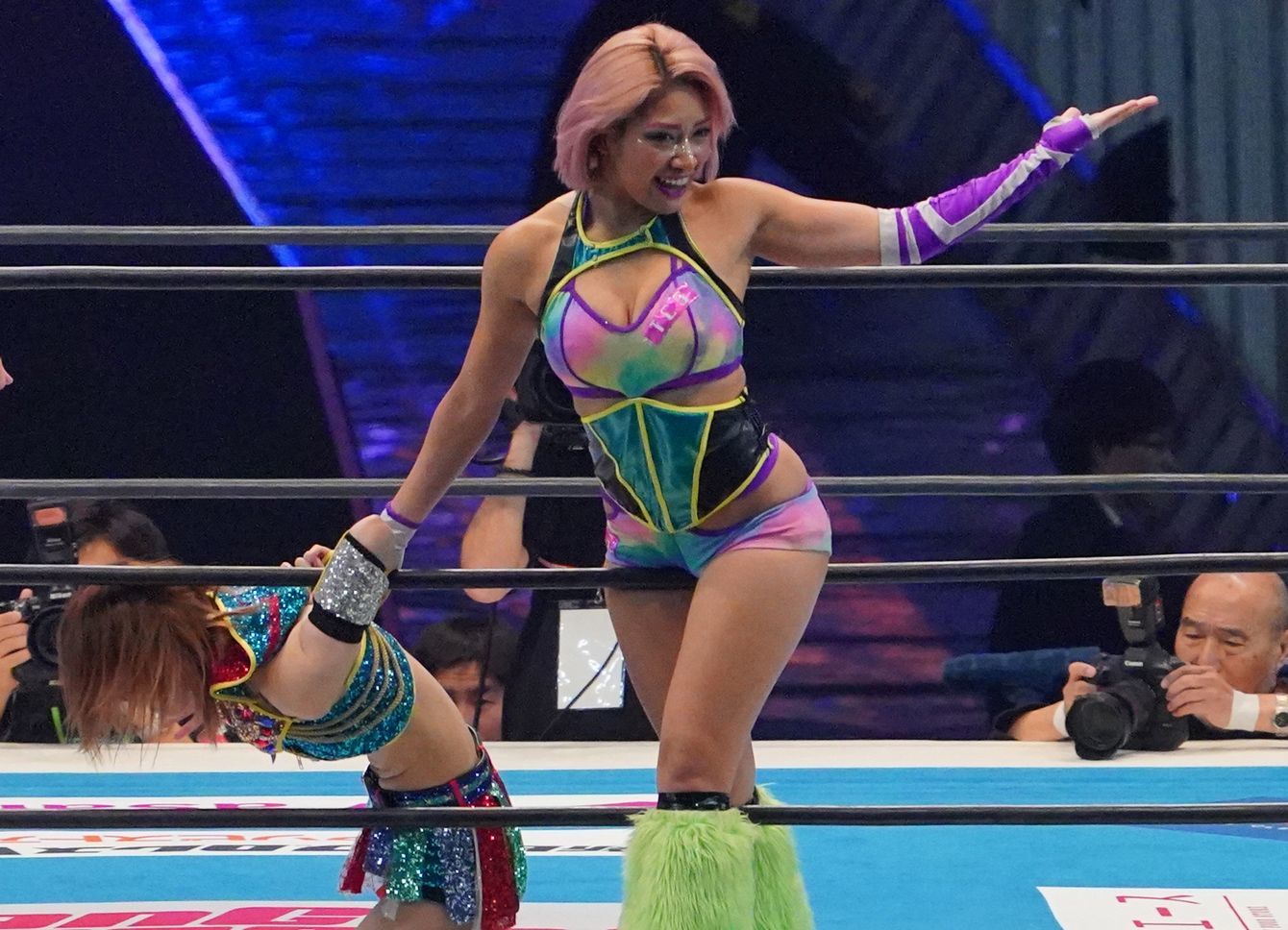 <新日本プロレス>岩谷麻優(左)を攻める木村花(東京ドーム、2020年1月4日)