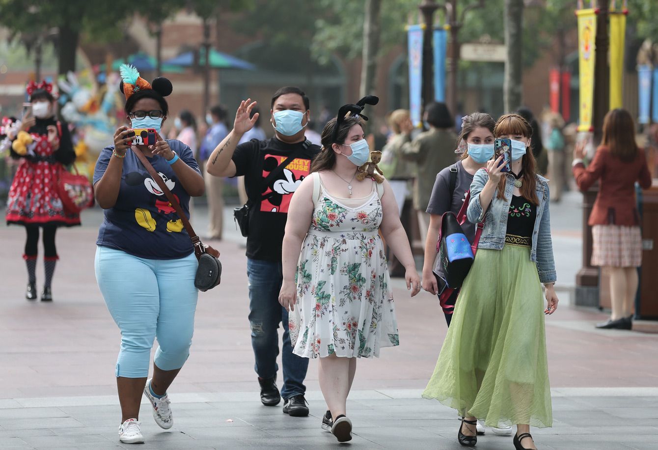 2020年5月11日、上海ディズニーランドで観光客が楽しむ様子。中国でのCOVID-19の収束後、ディズニーランドのテーマパークが再オープンしたのは世界でこれが初めて。