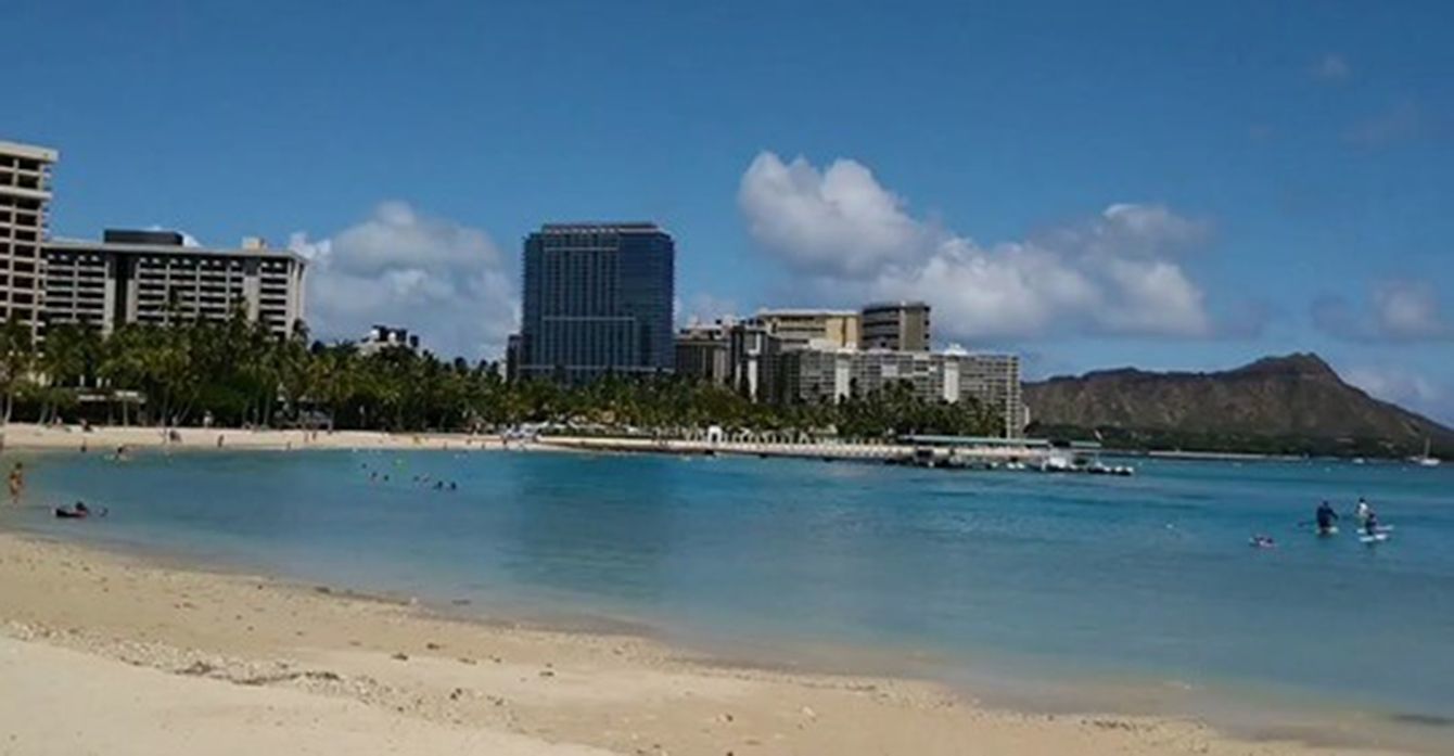 人影まばらなヒルトン・ハワイアン・ビレッジ前のビーチ(5月10日)