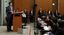 原稿を確認する安倍首相。手前には透明なパネルに文字を映し出す「プロンプター」がある。