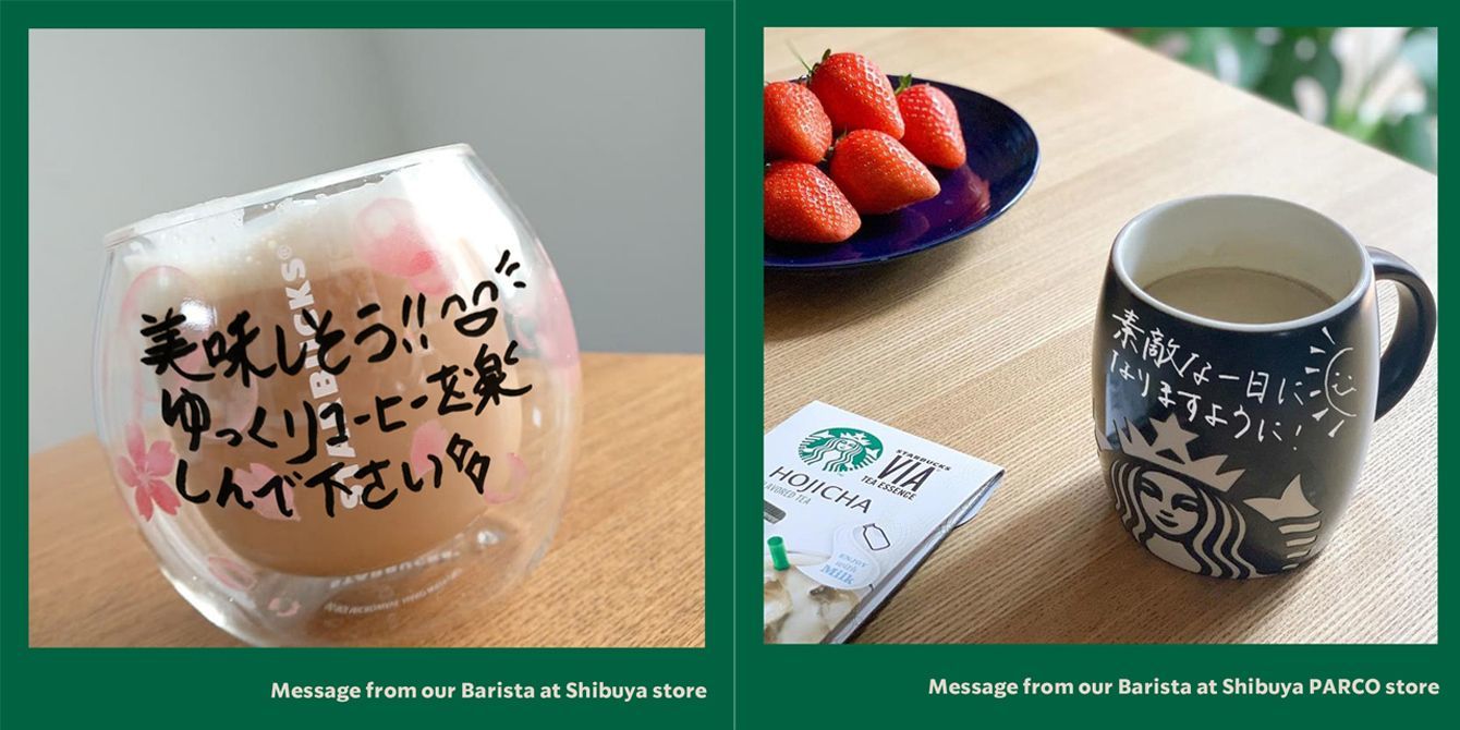 (左)バリスタがメッセージを書いたマグカップの写真/(右)渋谷パルコ店のバリスタが書いたメッセージ