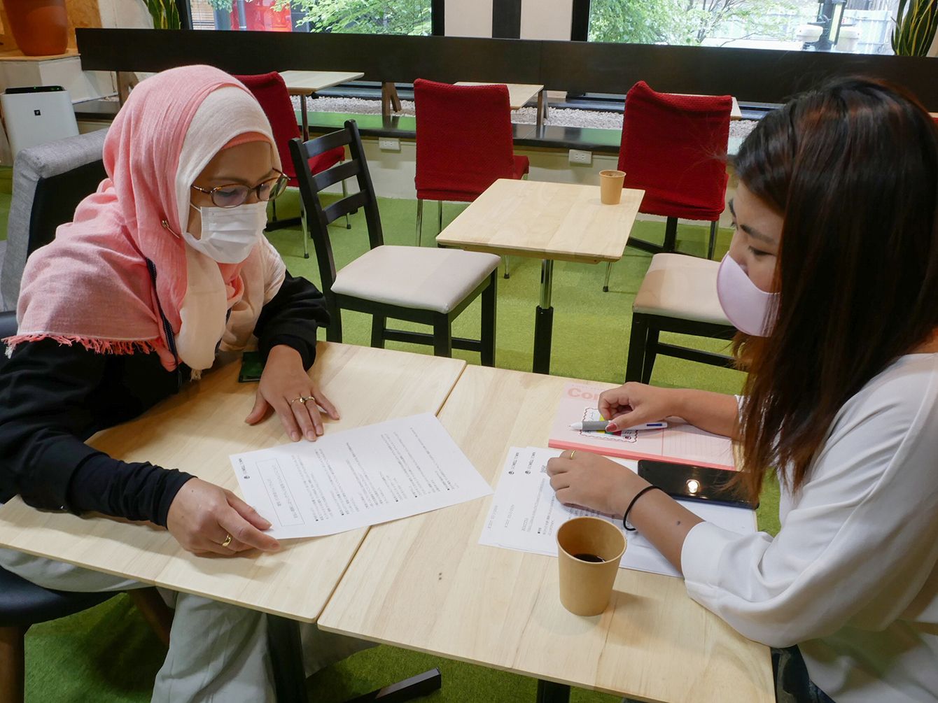 新型コロナウイルスに関する情報について、平易に書かれた資料を使って留学生に説明するインドネシア人スタッフ(左)=2020年5月9日、東京・銀座