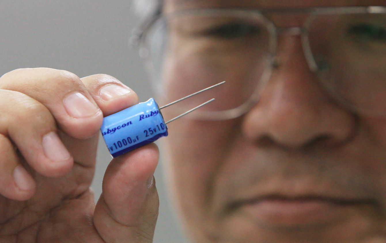 トヨタ自動車の品質監査棟で行われる人材育成過程の説明で、コンデンサを手にする作業員。同社の「現地現物」主義にのっとり、各種の部品を用いて人材育成を行う=2010年3月30日、愛知・豊田市の同社本社