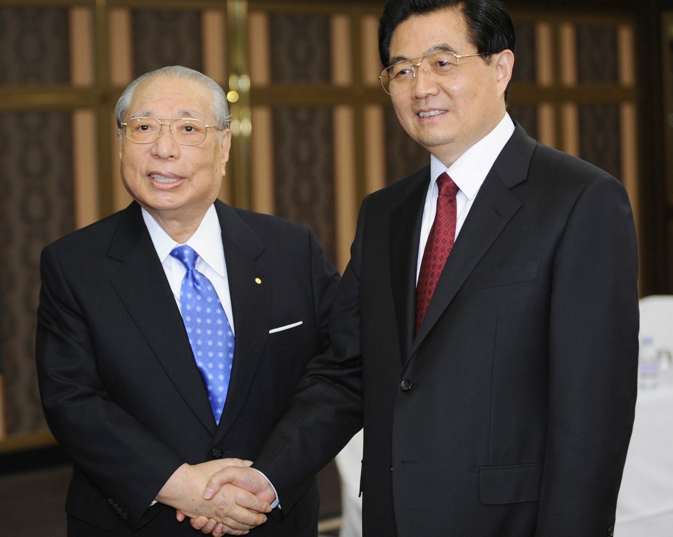 2008年5月8日、東京都内のホテルで、会談を前に創価学会の池田大作名誉会長(左)と握手する中国の胡錦濤国家主席。