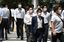 真夏日を迎えた東京・大手町でマスク姿で歩く人たち=2020年6月9日