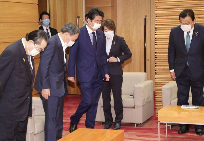 閣議に臨む安倍晋三首相(中央)ら=2020年6月19日、首相官邸