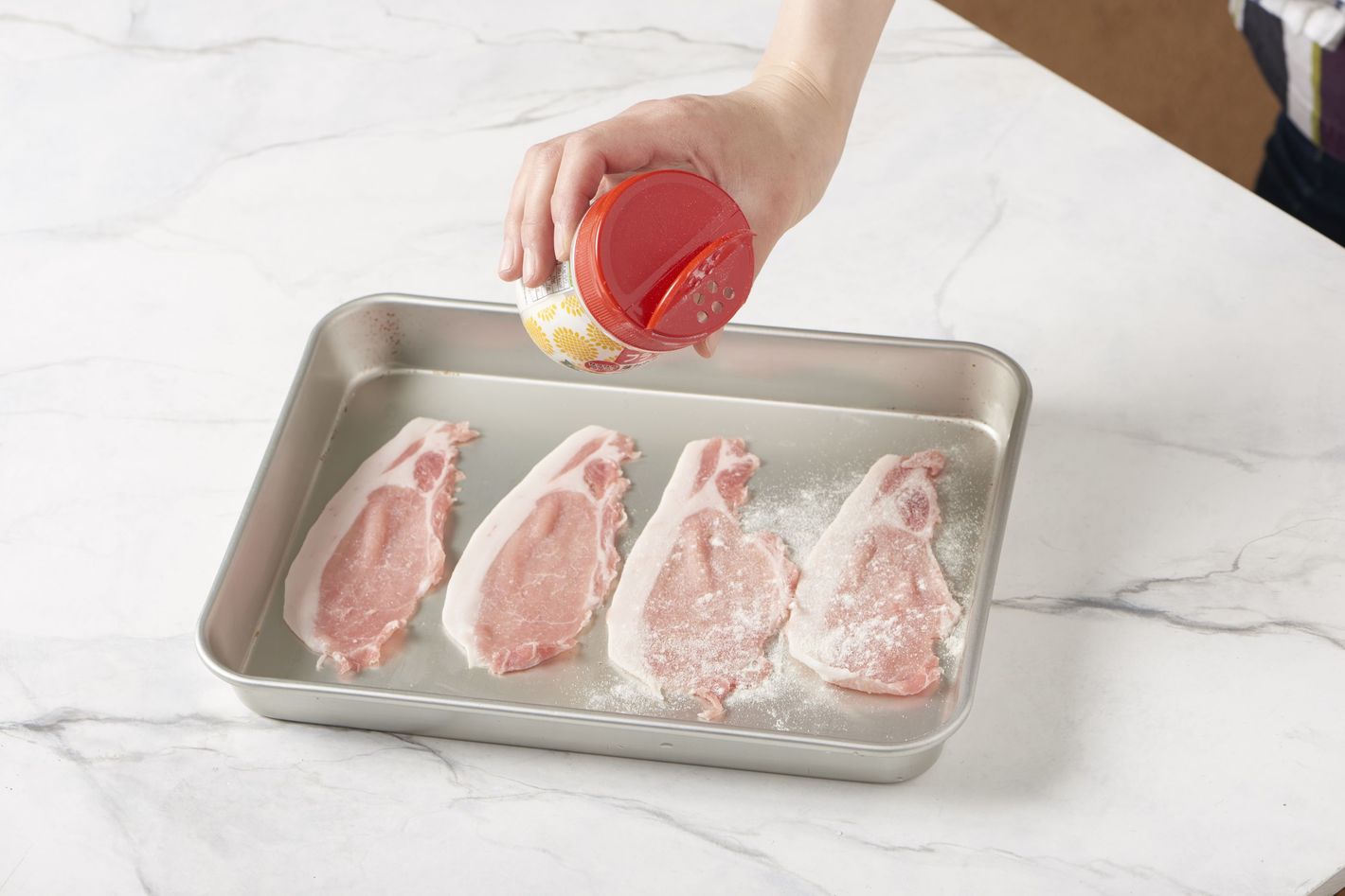 クッキングフラワーは薄力粉を少量使いたいとき、片手でパパッと振りかけることができる。