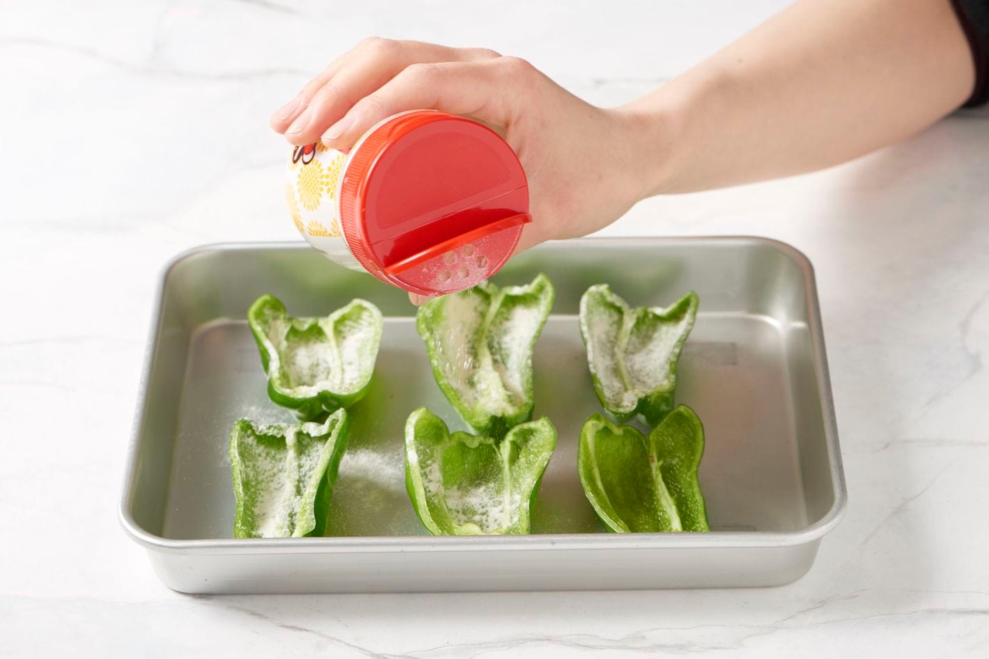 クッキングフラワーは薄力粉を少量使いたいとき、片手でパパッと振りかけることができる。