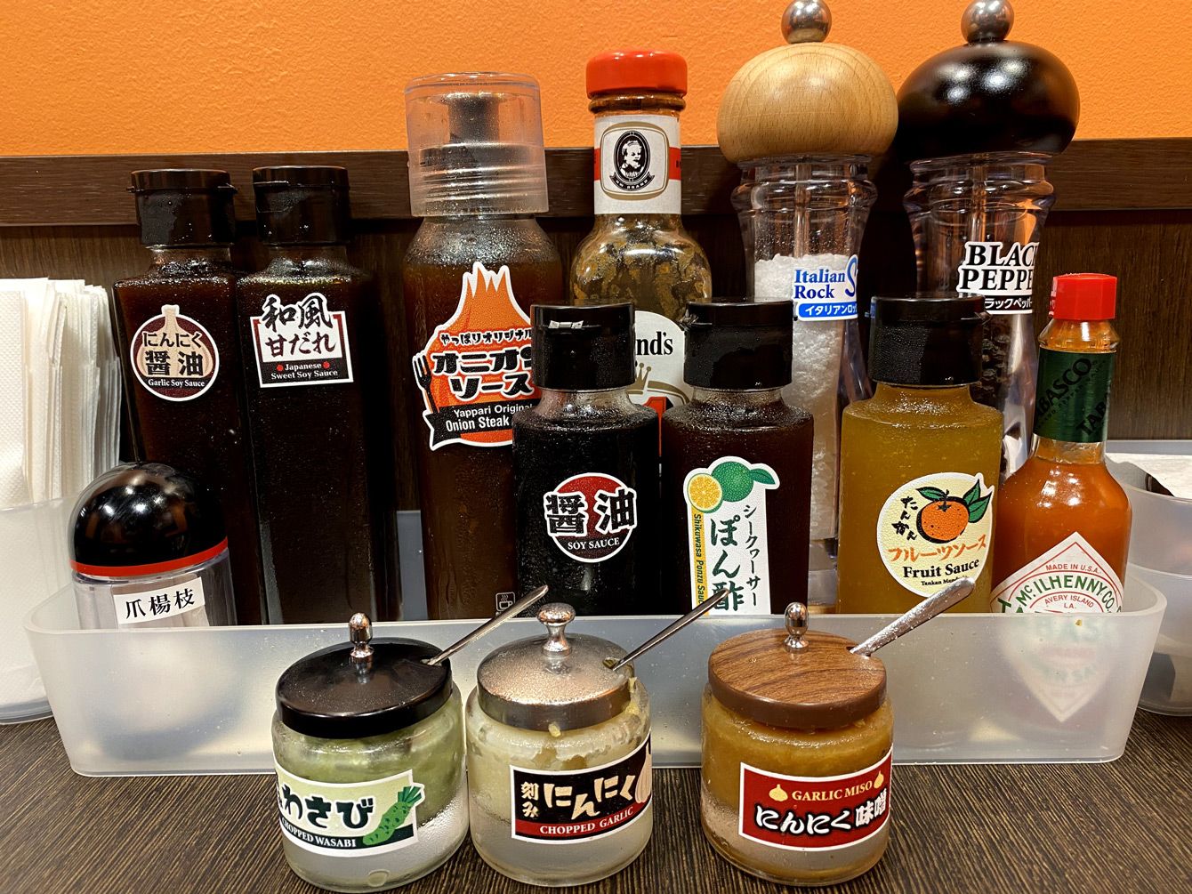 タレ皿の平面部分にわさびなどのトッピングも載せることができる。