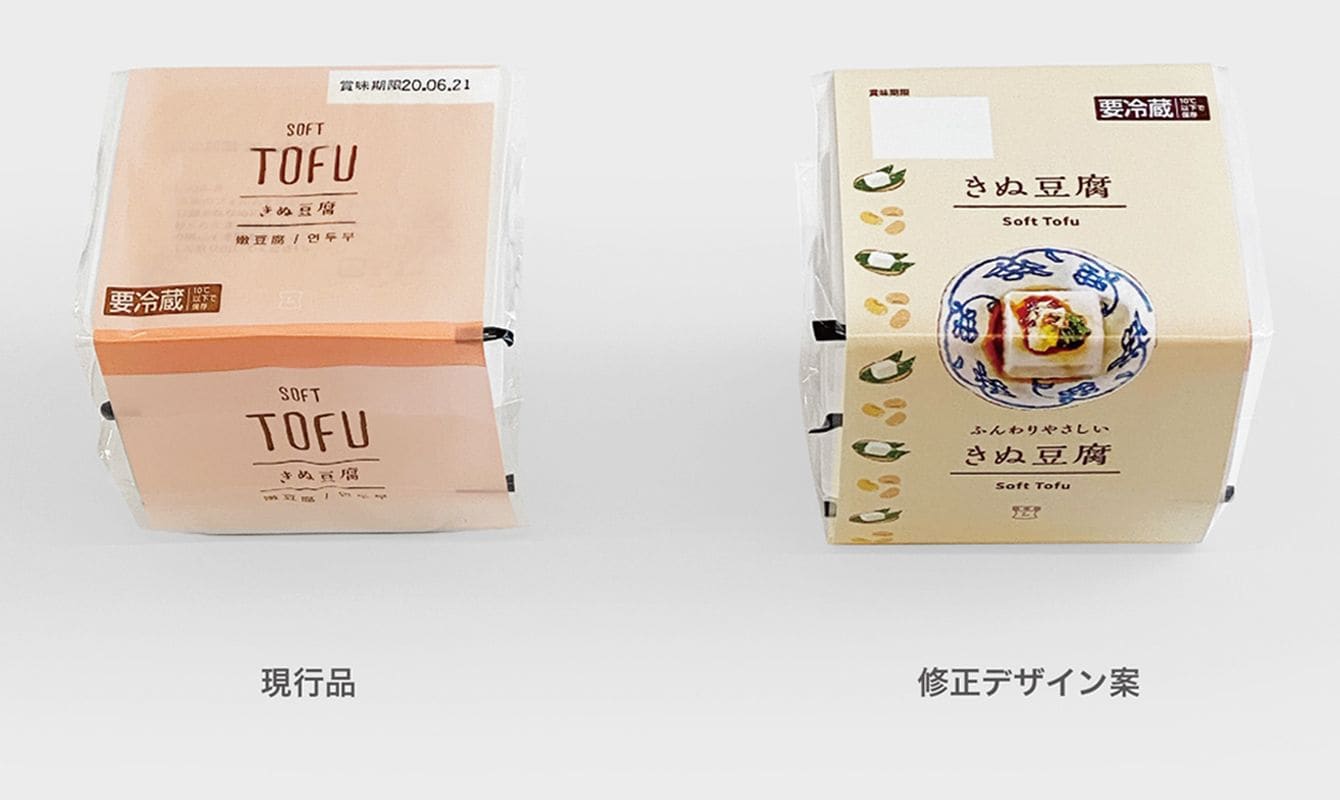 現行品の「豆腐 3個入り 絹」と、7月に発売する「豆腐 3個入り 絹」の修正デザイン案