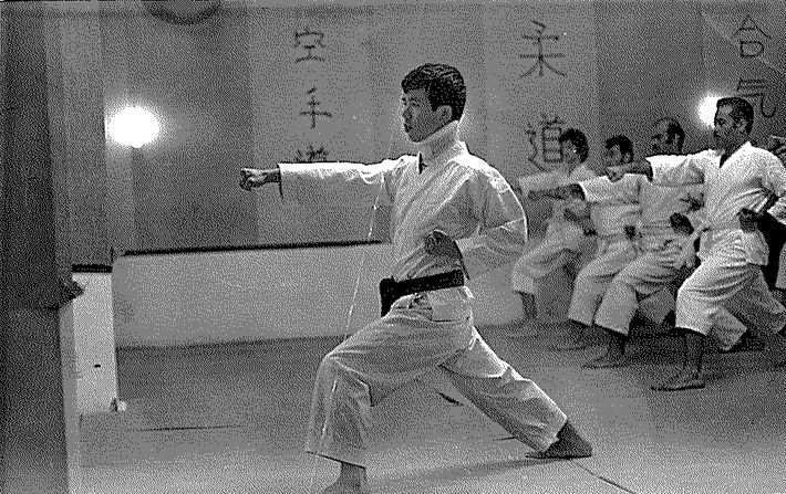 コルセットをしたまま空手を指導する岡本秀樹氏