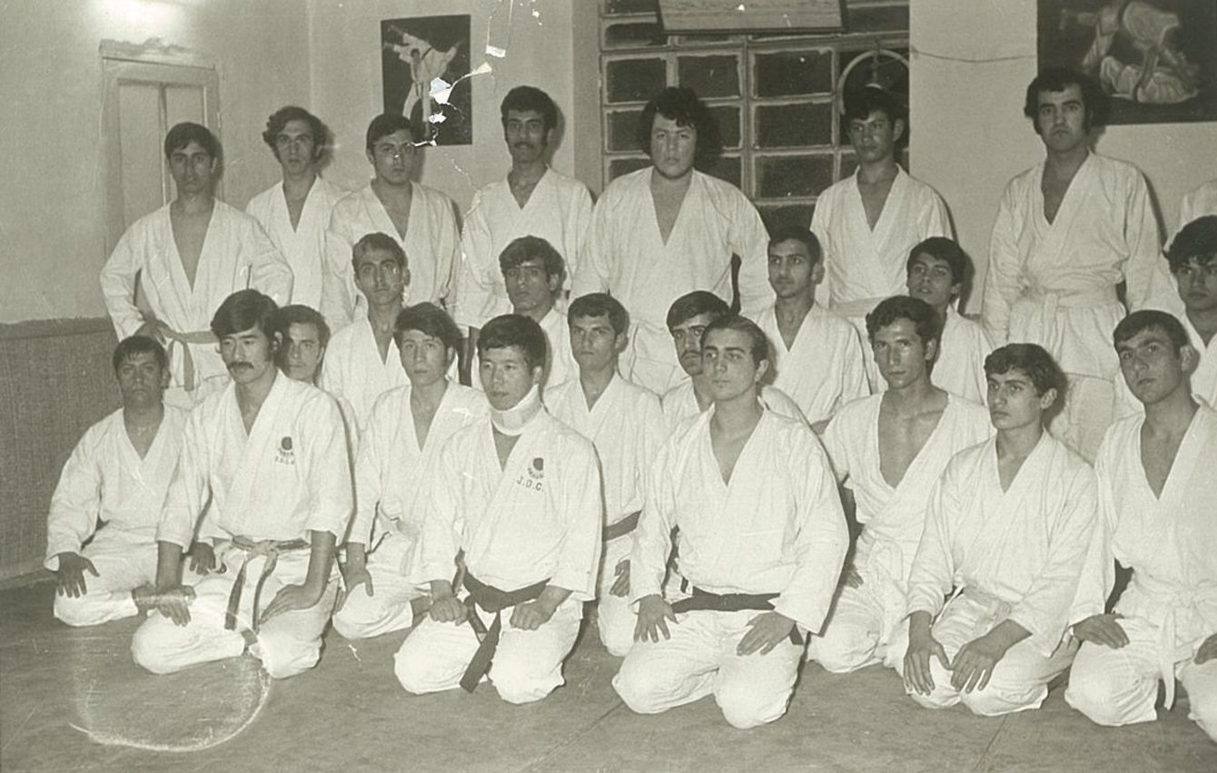 首の骨折から復帰し、コルセットをしたままベイルートで空手指導を再開した岡本秀樹氏(前列中央)。左は吉村徳政氏