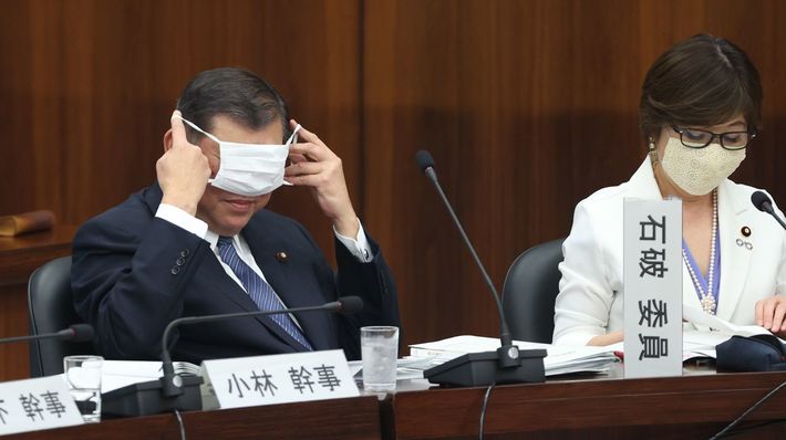 今国会初めて開かれた衆院憲法審査会の答弁前、マスクを着ける自民党の石破茂元幹事長(左)=2020年5月28日、国会内