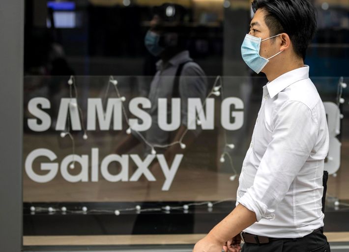 2020年7月14日、中国・上海のサムスンの店舗の前を通り過ぎる人。WHOは、ウイルスの起源をたどるため、疫学者と動物病の専門家の派遣