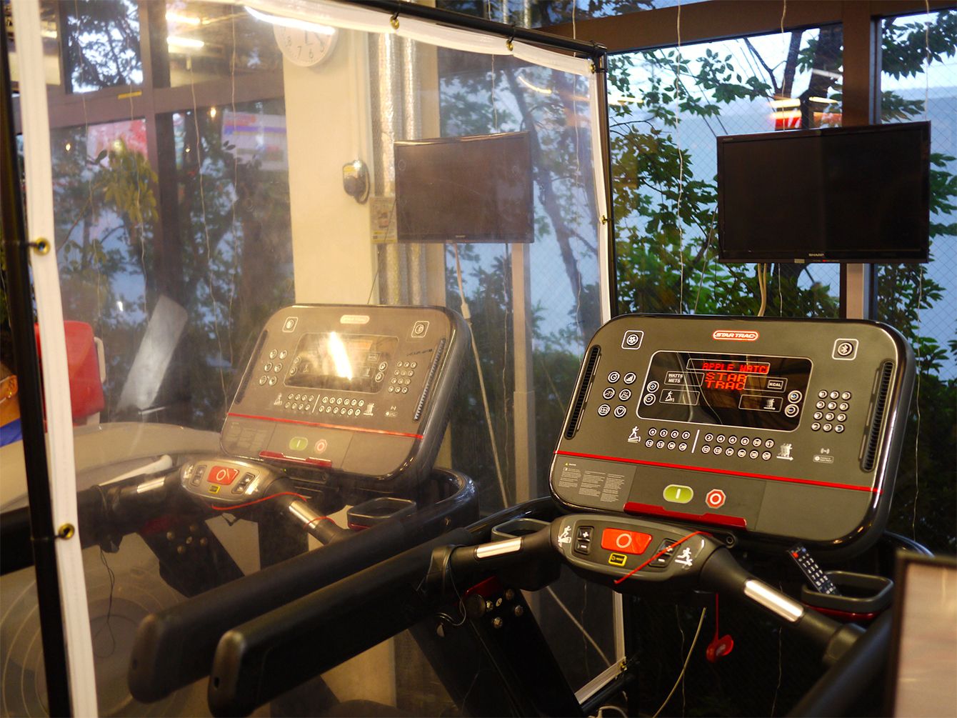 ランニングマシンには飛沫防止のアクリル板を設置。