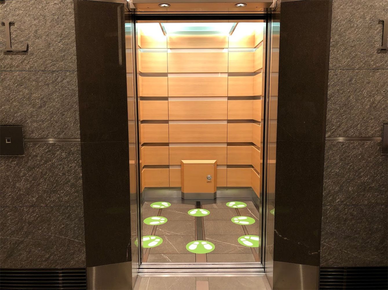 六本木ヒルズのエレベーターは8人乗り。フットプリントで人数だけでなく、互いに向かい合わないような工夫も。