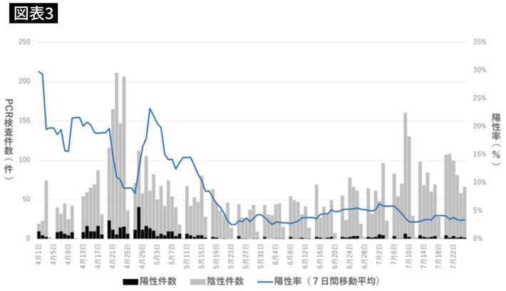 2月~7月末までの東京都が公開したPCR検査数と陽性率、重症者数(図版作成=大和田潔)