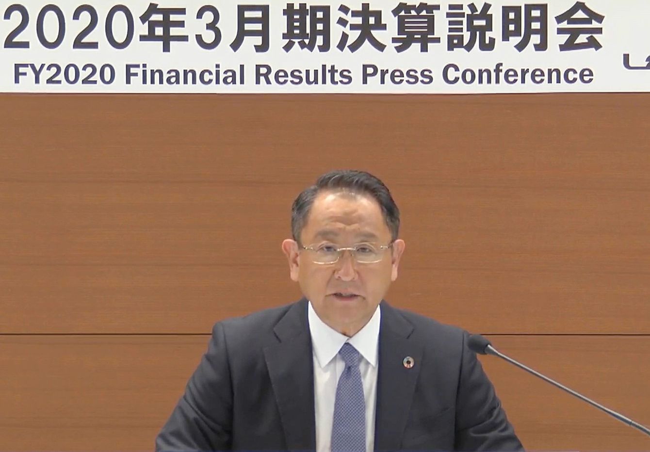 2020年3月期連結決算の記者会見に臨むトヨタ自動車の豊田章男社長=2020年5月12日[トヨタ自動車のホームページより]