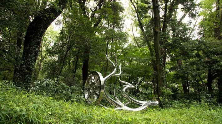 明治神宮鎮座100年祭を祝う「神宮の杜芸術祝祭」の野外彫刻展で公開されている松山の作品、〈Wheels of Fortune〉。鹿の角と車輪を組み合わせた。