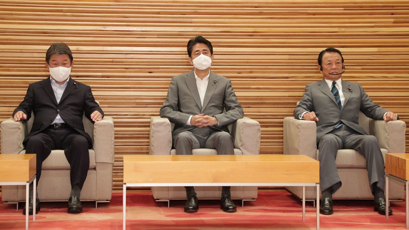 閣議に臨む安倍晋三首相(中央)ら=2020年8月11日、首相官邸