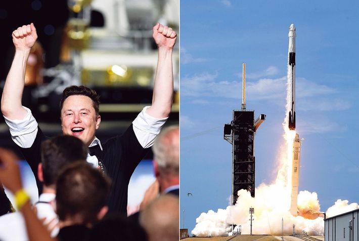 スペースX創業者のイーロン・マスクCEO(左)。スペースXが開発した宇宙船「クルードラゴン」が2020年5月30日に打ち上げられ、国際宇宙ステーション(ISS)への有人飛行を成功させた(右)。民間企業が開発した有人宇宙船によるISSへの有人飛行は世界初。