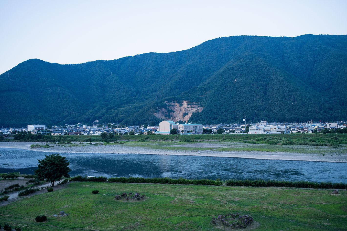 夜が更ける前の上山田温泉街から、千曲川を望む。
